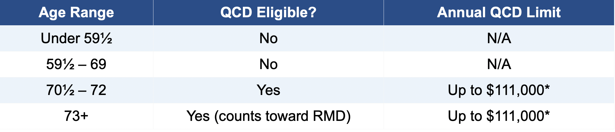 * QCD limit is indexed for inflation and is $111,000 per individual for 2026 ($222,000 for married couples, each from their own IRA). Consult your tax advisor about current limits. Source: Give From Your IRA | AARP Foundation