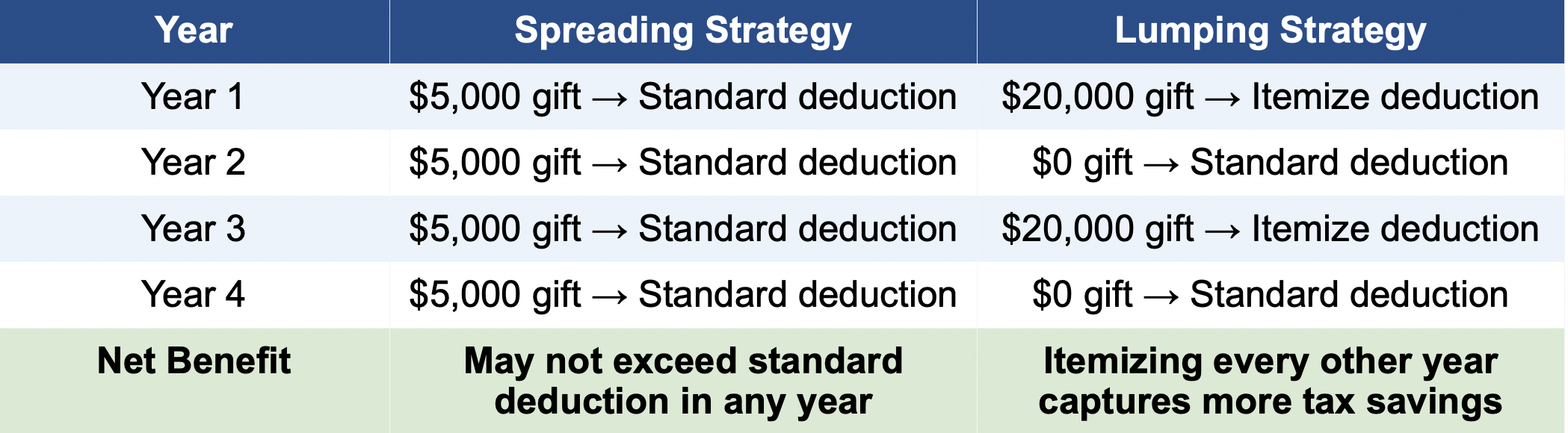 For those not yet at QCD age — or who give primarily through cash — a strategy called "lumping" or "bunching" charitable gifts can help you take advantage of available tax deductions. Instead of giving a modest amount every year and relying on the standard deduction, you front-load two or more years of giving into a single tax year, allowing you to itemize that year and capture a larger deduction. The following year you revert to the standard deduction. The chart below illustrates this concept: