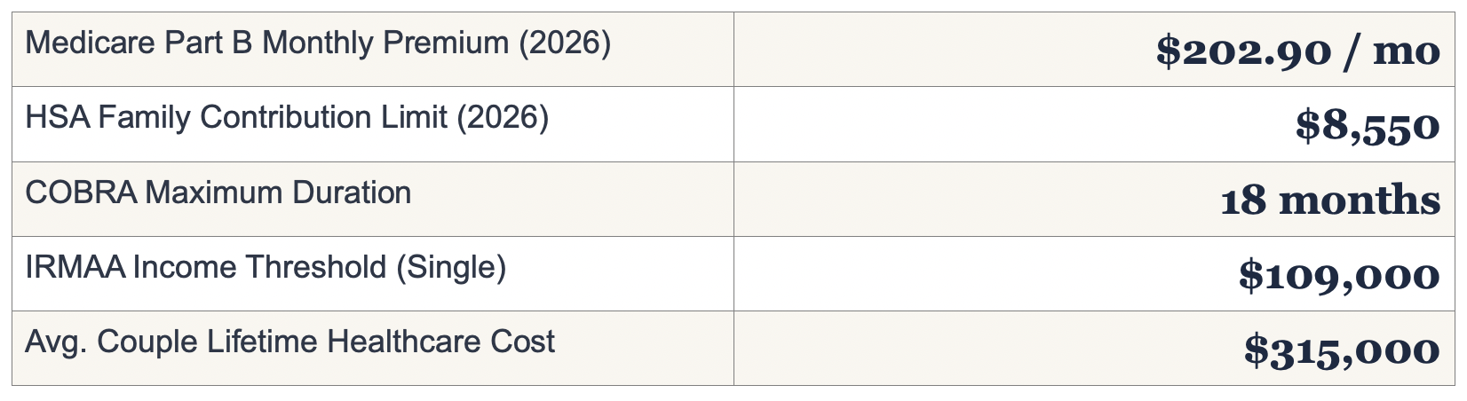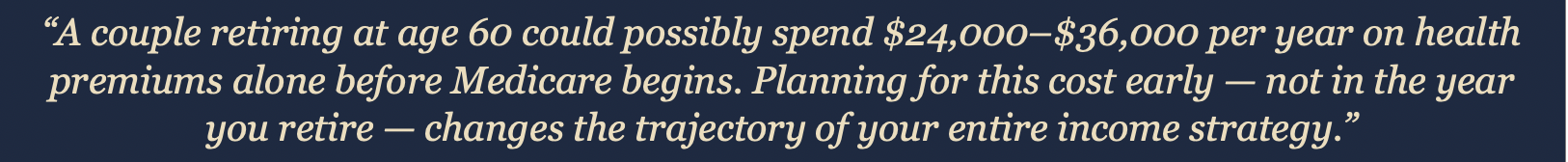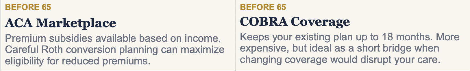 The most common paths for coverage during this period are COBRA continuation from your former employer (available for up to 18 months), enrollment in an ACA Marketplace plan through Healthcare.gov, or joining a spouse’s employer plan if they are still working. Each option carries different costs, network limitations, and tax implications — which is why we build healthcare cost projections directly into your retirement income plan.